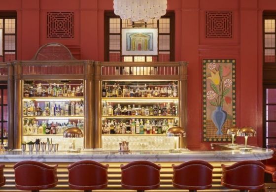 La zona del bar ha sido rediseñada sensiblemente. Las paredes con paneles originales se conservaron y se les dio un acabado de laca de alto brillo en coral vivo. Candelabros de cristal de murano se reparten por todas partes. Se han sumado 36 piezas de arte originales del artista Luke Edward. La barra cuenta con una tapa de mármol y vidrio fundido con un frente de madera de alto brillo. El área de la barra trasera muestra un espejo antiguo y detalles de bronce, lo que ayuda a reflejar la herencia icónica del hotel y el edificio. Donde una vez hubo el polvoriento vestíbulo de entrada al hotel Bloomsbury, ahora hay una brillante sala plena de resplandor. El truco de Brudnizki es simple: hacer una habitación colorida pone a la gente feliz.